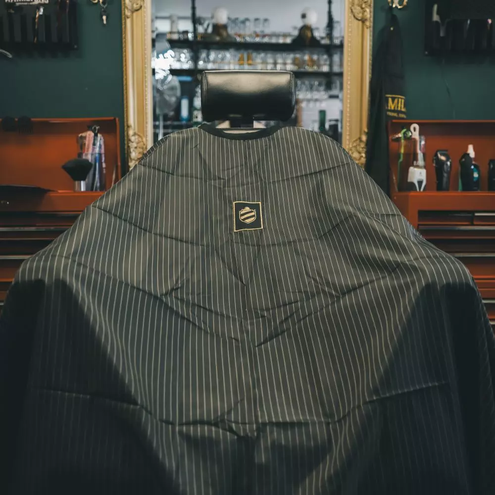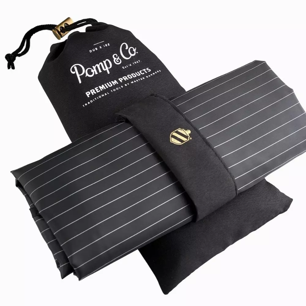Pomp & Co. Barber Cape - Peleryna fryzjerska to połączenie najwyższej funkcjonalności z klasyczną, irlandzką estetyką, stworzone z myślą o profesjonalnych barberach oraz wymagających użytkownikach domowych. Wykonana w ponadczasowym czarnym kolorze z subtelnymi białymi prążkami, peleryna wyróżnia się prestiżowymi detalami, takimi jak haftowana złotą nicią tarcza oraz ozdobny guzik służący do zapięcia. Dzięki zastosowaniu lekkiego i oddychającego materiału, Pomp & Co. Barber Cape - peleryna fryzjerska zapewnia maksymalny komfort podczas strzyżenia, nie krępując ruchów i pozwalając skórze swobodnie oddychać. To akcesorium, które w nienachalny sposób podkreśla profesjonalizm każdego stanowiska pracy, łącząc tradycyjny styl barberski z nowoczesnymi rozwiązaniami.